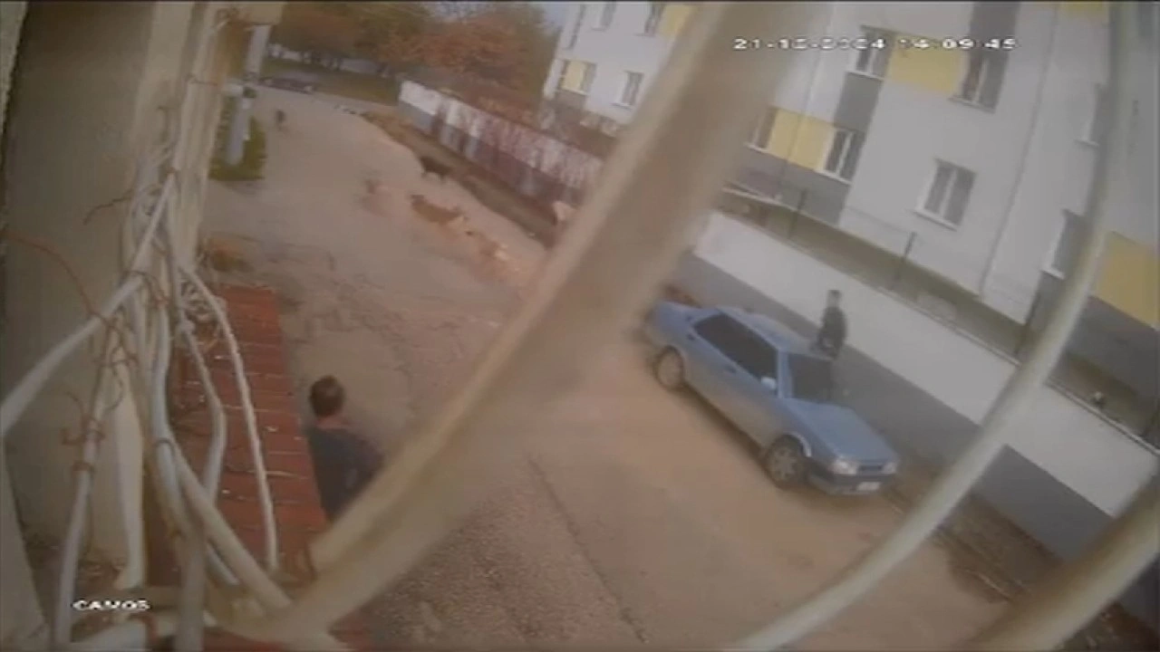 Gencin 8 köpeğin saldırısından yara almadan kurtulduğu anlar, çevredeki bir binada bulunan güvenlik kamerası tarafından görüntülendi.