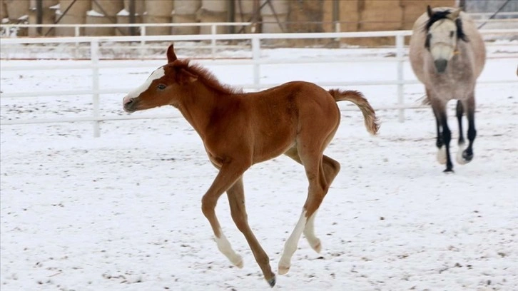 Beyaz örtüyle bu yıl ilk kez buluşan Anadolu Tarım İşletmesindeki taylar ve kısraklar, kar ile kaplanan meralarda doyasıya koştu.