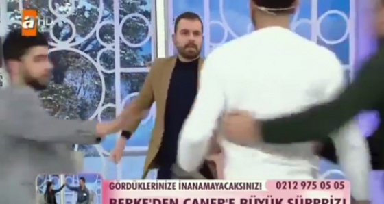 ATV ekranlarında yayınlanan Esra Erol'un dün yayınlanan canlı yayınında gerilim yükseldi. Damat adayları Umut ve Arda bir gelin adayı için birbirlerine girince Esra Erol yayna ara vermek zorunda kaldı. Canlı yayına tekrar başlayan Esra Erol ise yaşananlardan dolayı herkesten özür diledi...