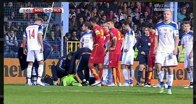 EURO 2016 Elemeleri G Grubu'nda oynanan Karadağ-Rusya maçında çıkan olaylar nedeniyle karşılaşma yarım saat dururken, Rusya kalecisi hastaneye kaldırıldı.