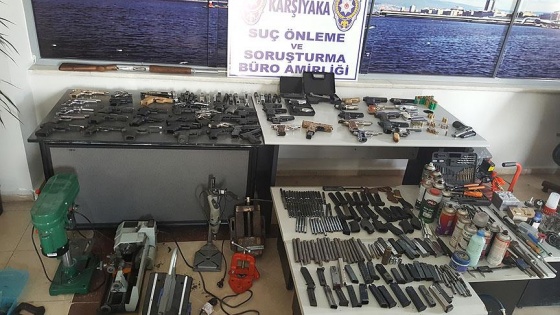 Karşıyaka ilçesinde düzenlenen operasyonda, evinin çatısında kurduğu atölyede kurusıkı tabancaları normal tabancaya dönüştürdüğü belirlenen A.A. gözaltına alındı.