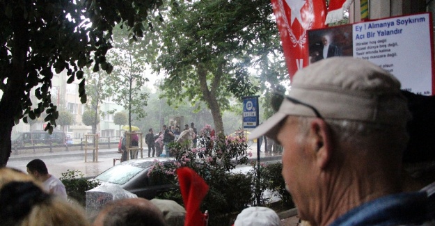 Alman Meclisi’nin aldığı tartışmalı karar sonrası bir grup Vatan Partililer, Gümüşsuyu’nda bulunan Alman Konsolosluğu önünde toplandı. Yoğun güvenlik önlemleri altında gerçekleştirilen basın açıklaması sırasında sağanak yağmur başladı. Yağmur ile birlikte basın açıklaması kısa kesilirken partililer, saçakların altına sığındı. Bazı partililerin ellerinde taşıdıkları dövizleri kendilerine siper ederek yağmurdan korunmaya çalıştığı görüldü.
