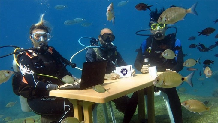 Suyun altında kurdukları masanın etrafına oturan dalgıçlar, Turizm Haftası dolayısıyla temsili olarak sezon değerlendirmesi yaptı. Dalgıçların su altındaki ilginç görüntüsü su altı kamerasıyla kaydedildi. Bir dalgıç önündeki bilgisayara not alırken dalgıcın biri de diğerinin sorduğu sorulara temsili olarak yanıt verdi.