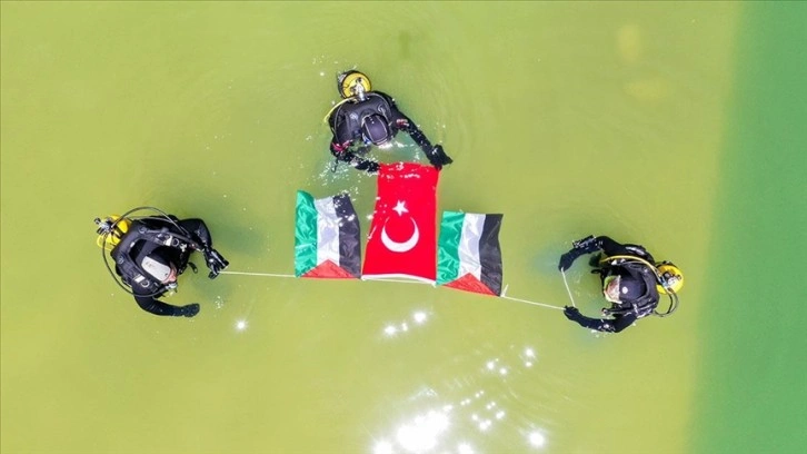 Dalgıçlar, su üstünde ve dalış yaptıkları 30 metre derinlikte Türk ve Filistin bayrağı açtı.