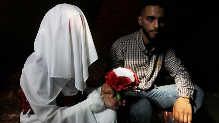 Yaklaşık 2 aydan bu yana Deyr Belah'taki Şehit Muhammed ed-Durra Stadı'ndaki çadır kentte yaşayan Mahmud ve Şeyma Hazik, yerel danslar ve müzikler eşliğinde dünyaevine girdi.