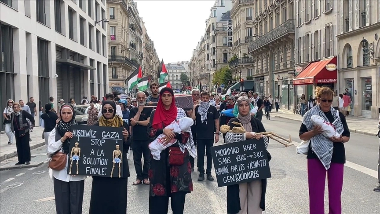 Bölgede kıtlık nedeniyle hayatını kaybeden Gazzelilerin durumuna dikkati çekmek için plastik iskeletler taşıyan göstericiler, İsrail'e karşı yaptırım uygulanması çağrısında bulundu.