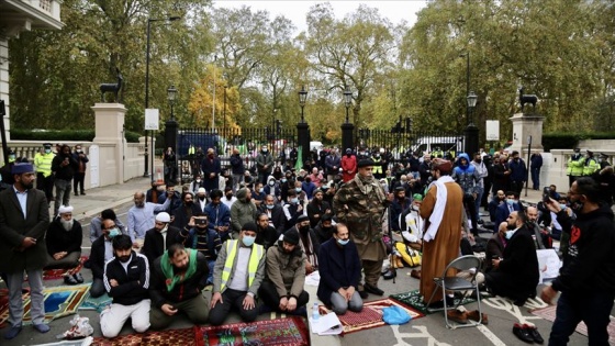 Fransa Cumhurbaşkanı Emmanuel Macron'un İslam karşıtı sözleri ve Charlie Hebdo dergisinin Hz. Muhammed'e hakaret içerikli karikatürleri yayınlaması, Fransa'nın Londra Büyükelçiliği önünde protesto edildi.