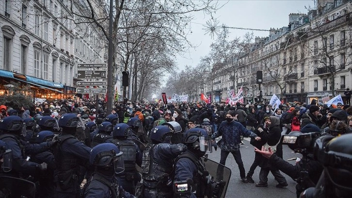Göstericiler, Fransa Cumhurbaşkanı Emmanuel Macron’un istifasını talep eden ve faşizm karşıtı sloganlar attı.