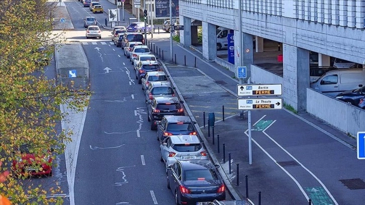Fransa'da benzin istasyonlarının yaklaşık yüzde 30 kadarında akaryakıt tedarik sıkıntısı yaşanması nedeniyle Goussainville'de birçok mağazanın bulunduğu bir alanda yer alan benzin istasyonunun önünde uzun kuyruklar oluştu.
