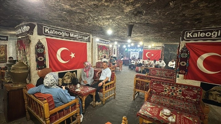 Gaziantep savunmasında yiyecek ve cephane saklanan Şekeroğlu Mahallesi'ndeki mağara kafeye gelen vatandaşlar, serinlemeye çalışıyor.