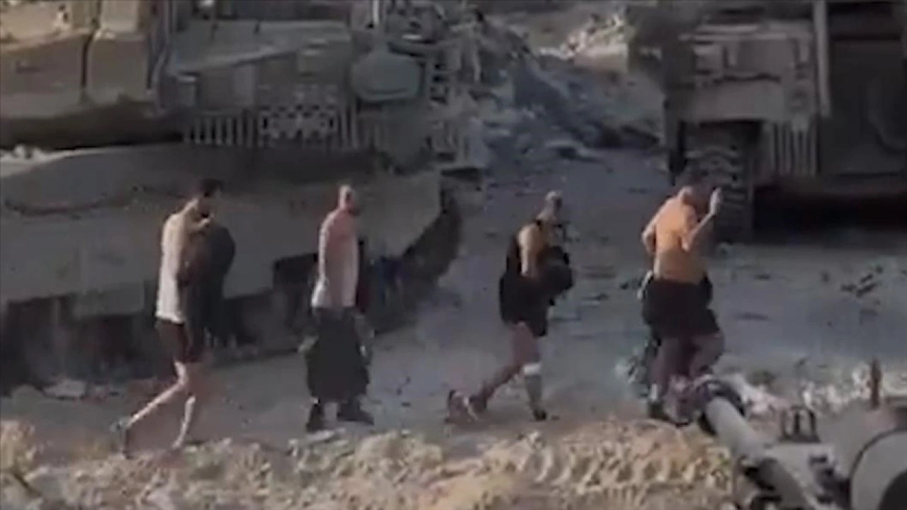 İsrail askerlerinin elbiselerini çıkarttığı bir grup Filistinli erkeğin iç çamaşırlarıyla tank ve zırhlıların önünden elleri havada geçtiği kameraya yansıyor.