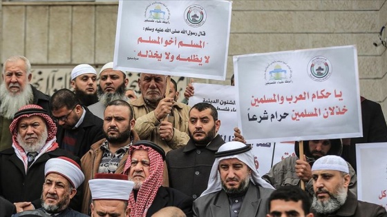 Gazze Şeridi'ndeki Filistin Alimler Birliğinin çağrısı üzerine El-Ketibe Camisi önünde düzenlenen gösteriye katılanlar, "Müslümanların yardımsız bırakılması haramdır" ve "Müslüman Müslüman'ın kardeşidir, onu yardımsız bırakmaz" yazılı pankartlar taşıdı.