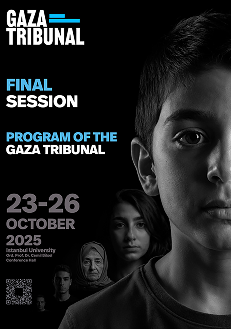 Gazze Mahkemesi final oturumu programı >>>????"Gazze Mahkemesi: Nihai Oturum" kapsamında paneller, söyleşileri belgesel gösterimleri ve çeşitli oturumlarla Gazze'de yaşanan soykırım ele alınacak. Filistin ve Gazze'deki görgü tanıklarının ifadelerine de yer verilecek.