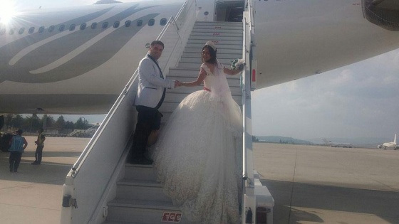 İşlemlerinin ardından tarifeli uçağa binen çift, yolculuk sırasında uçaktaki o anlarını da cep telefonuyla görüntüledi. Uçakta da oynamayı sürdüren gelin ve damat, böylece hayallerini gerçekleştirmiş oldu.