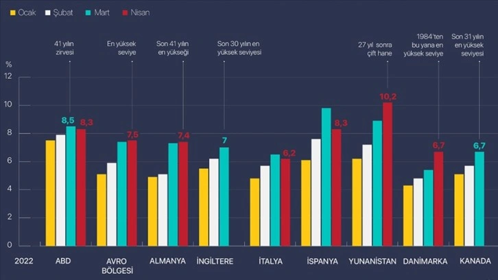 Uluslararası Para Fonu'nun (IMF) Dünya Ekonomik Görünümü raporunda, gelişmiş ekonomi olarak sınıflandırılan 40 ülkenin yarısından fazlasında enflasyonun yüzde 5'in üzerinde seyretmesi dikkati çekerken, yüksek enflasyonda bu tarz ani, ortak bir sıçrama 20 yılı aşkın süredir görülmedi.