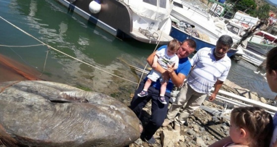 Deniz kenarına çekilen balıkla bazı vatandaşlar selfi yaparken, çok sayıda insan meraklı gözlerle inceledi.
