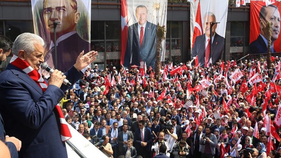 Yıldırım, İstanbul'un bunları fazlasıyla hak ettiğini aktararak, "İstanbul Şehitler Köprüsü'nü tuttu, alçaklara geçit vermedi. İstanbul'un 99 tane şehidi var. Şehitlerimizin aziz hatıralarını, rahmetle minnetle anıyoruz. Gazilerimize Allah'tan şifalar diliyoruz. Değerli kardeşlerim, bu sistem artık yürümüyor. 82 model darbeden kalma bir sistem, Türkiye'ye, bölünmüş yollarıyla, hava alanlarıyla, şehir hastaneleriyle büyümüş kalkınmış Türkiye'ye, bu elbise dar geliyor. Bu vesayet anayasasını çöpe atmaya hazır mısınız?" ifadelerini kullandı.
