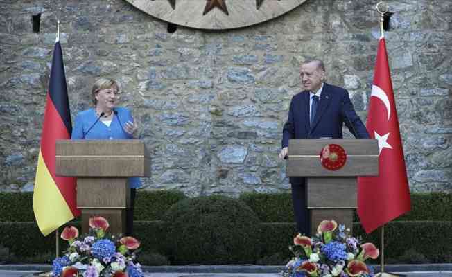 Merkel ile Cumhurbaşkanı Erdoğan'ın Huber Köşkü'ndeki samimi görüntülerine yer verilen diğer paylaşımda da Merkel'in basın toplantısında yaptığı açıklamalardan oluşan özet konuşmalar aktarıldı.