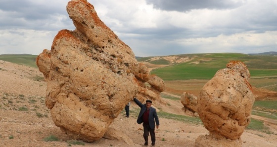 Sivas'ın Kangal ilçesi Sarıpınar köyü kırsalında bulunan mantar şeklindeki ilginç kayalar ilk kez görenleri şaşkına çeviriyor. Tamamen doğal olarak farklı kayalardan destek alarak ayakta duran dev kayalar, elle yerleştirilmiş gibi bir görüntü veriyor. Kayalar köy sakinleri tarafından ziyaret yeri olarak kullanılırken kayaların yanına giderek dua edenler ve kurbanını kayalıklarda kesenlerde oluyor.