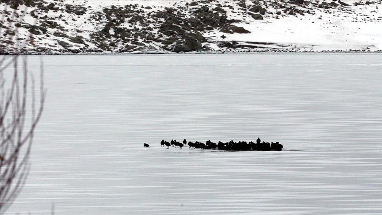 Ardahan ve Kars arasında yer alan Çıldır Gölü, soğuk havaların etkisiyle yüzeyinin büyük bölümü buzla kaplandı.