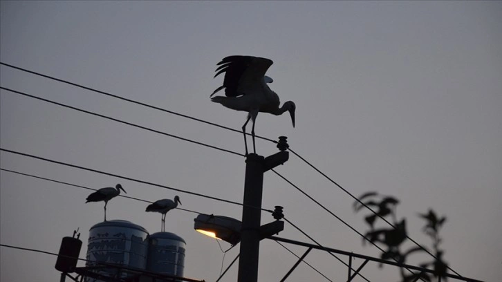 Göç yolundaki çok sayıda leylek, ilçe merkezine gelerek binaların çatılarına ve direklerin üzerine kondu.