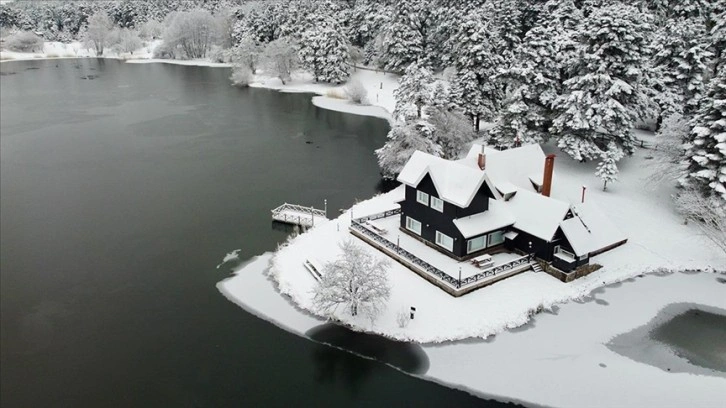 Göl kıyısında karla kaplı çam ağaçlarının altında yürüyüş yapıp fotoğraf çektiren vatandaşlar, doğanın renklerini bir arada görmenin keyfini çıkardı.