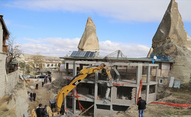 NEVŞEHİR (AA) - Nevşehir İl Özel İdaresi Genel Sekreterliği ekipleri, inşaatta bulunan çeşitli malzemelerin alınması için ara verilen iş yeri ve konut inşaatının yıkımına sabah saatlerinde yeniden başladı.