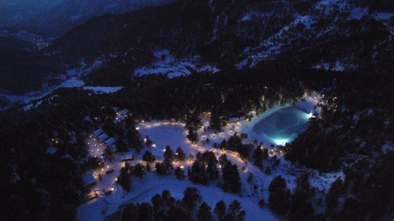 Zigana Dağı'nın eteklerindeki Limni Gölü Tabiat Parkı'nın kar yağışı sonrası gece ışıklandırılmış hali de AA kameramanı tarafından havadan görüntülendi.