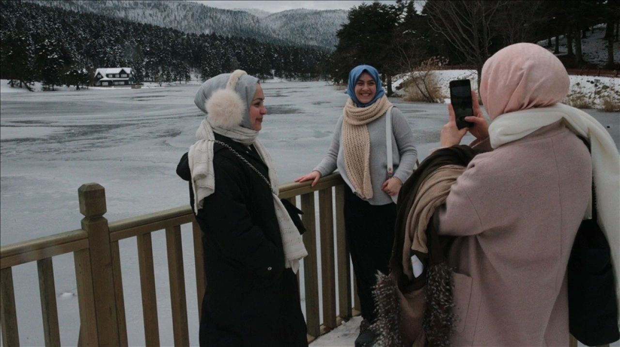 Soğuk havaya rağmen bölgeye gelenler, gölün etrafında yürüyüş yaptı, güzel manzara karşısında fotoğraf çektirdi.