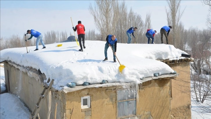 Bunun üzerine ilçeye 12 kilometre uzaklıktaki köye giden 10 gönüllü genç, küreklerle evin damında biriken karı temizledi.