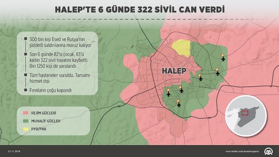 Suriye'de son 6 günde, Beşşar Esed rejimi tarafından düzenlenen ve Rus Hava Kuvvetlerinin destek verdiği saldırılarda, Halep kent merkezinin doğusunda 322 sivil hayatını kaybetti, bin 150'si yaralandı.