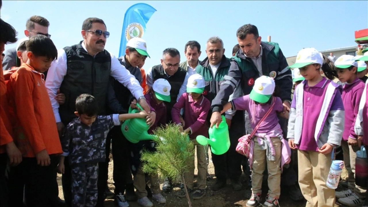 Konuşmaların ardından Vali Masatlı, Günay ve öğrenciler, toprakla buluşturulan 1000 fıstık çamı fidanına can suyu verdi.