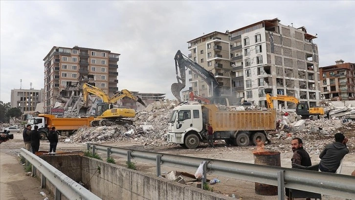 Antakya ve Defne ilçelerinde depremlerde yıkılan ya da ağır hasarı olduğu için yıkım kararı alınan binalarda enkaz kaldırma çalışmaları ekiplerce gerçekleştiriliyor.
