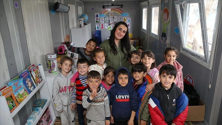 Hatay'da yıkılan binanın enkazından 56 saat sonra çıkarılan öğretmen Özgenur Demirci, Kahramanmaraş'ta bir konteyner sınıfta öğrencilerinin yüzlerini güldürebilmek için çabalıyor.