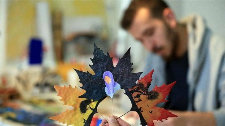 Sonbaharda topladığı çınar yapraklarını sanatla buluşturan Uşaklı gencin dikkat çeken eserleri alıcılardan talep görüyor.