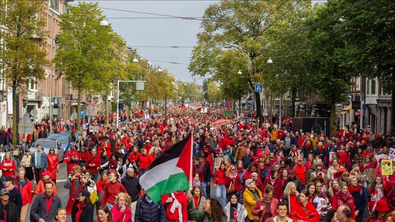 Hollanda'da yaklaşık 250 bin kişi, hükümetin İsrail politikasını protesto ettiÇok sayıda uluslararası ve yerel sivil toplum kuruluşunun (STK) ortak organizasyonuyla düzenlenen gösteri, "Kırmızı Çizgi" sloganıyla Müzeler Meydanı'nda başladı.