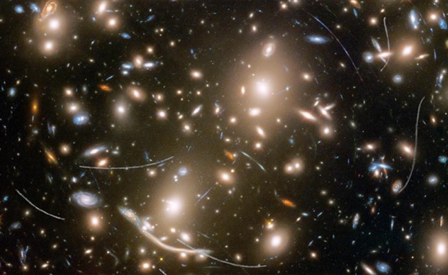 Hubble Uzay Teleskobu'nun kaydettiği uzak galaksi görüntülerinde yeryüzüne ulaşan galaksi yansımaları içinde yay biçimli çizgisel lekeler olduğu görülüyor.