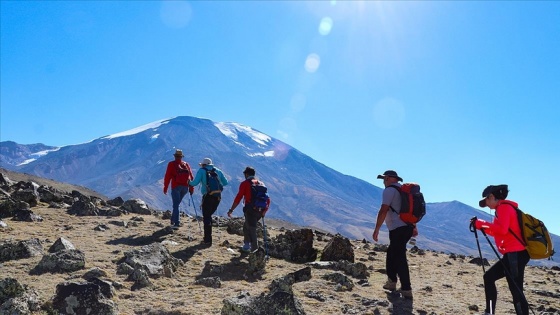 Dağcılar ve doğaseverler, Küp Gölü'nü görmek ve dağın kuzeybatı rotasını gezmek için Ağrı Dağı'na günübirlik tırmanışlar yapıyor.