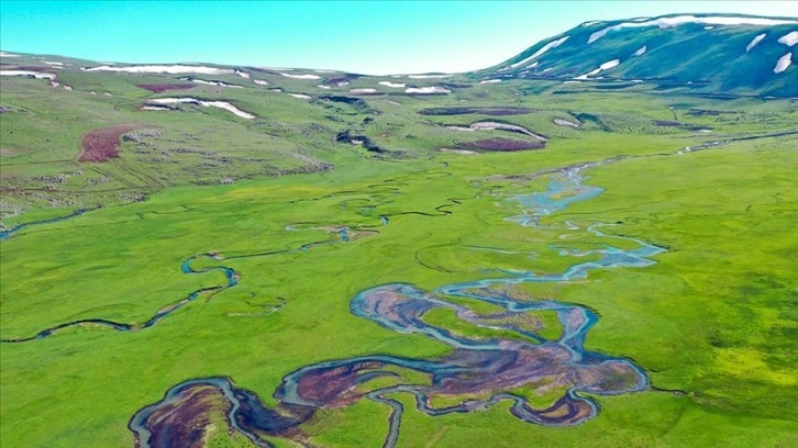 Yeşilin farklı tonları ve karlı dağlarla güzel manzaralar oluşturan kilometrelerce uzunluktaki menderesler, AA ekibince dronla görüntülendi.