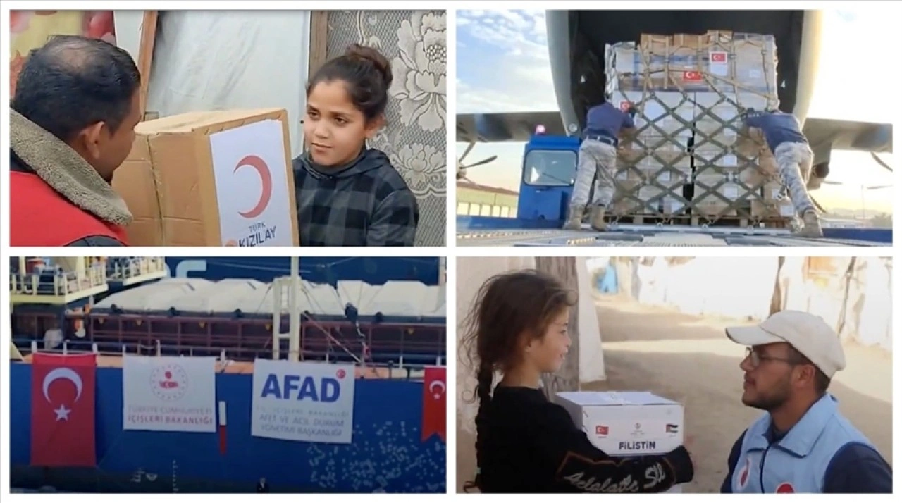 16 gemi ve 14 uçakla yardım sevk eden Türkiye, 281 bin 238 hijyen seti, 550 ton hijyen malzemesi, 1451 jeneratör, forklift, 3 mobil mutfak, 351 geçici barınma konteyneri, 25 bin 180 çadır, 113 bin 608 battaniye, 19 bin 798 uyku tulumu, 151 bin 455 barınma malzemesi, 25 bin 729 ton gıda, 65 bin 273 ton un, 3 bin 171 ton içme suyu, 469 bin 486 parça giyecek ve 1083 oyuncak setini Gazze'ye gönderdi.