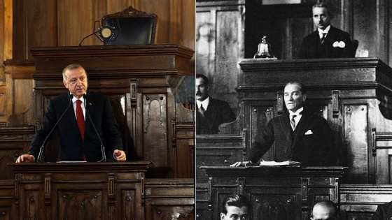 Cumhurbaşkanı Erdoğan, "Ecdadımızın emanetini yere düşürmemek, ezanlarımızı susturtmamak, bayrağı indirtmemek, haysiyetimizi çiğnetmemek için alın terimizle ve gerektiğinde canımızı ortaya koyarak mücadelemizi sürdürüyoruz. Bugün eski Meclis binasındaki bu törenimizi işte bu tarihi sürekliliğin bir sembolü olarak görüyoruz." dedi.