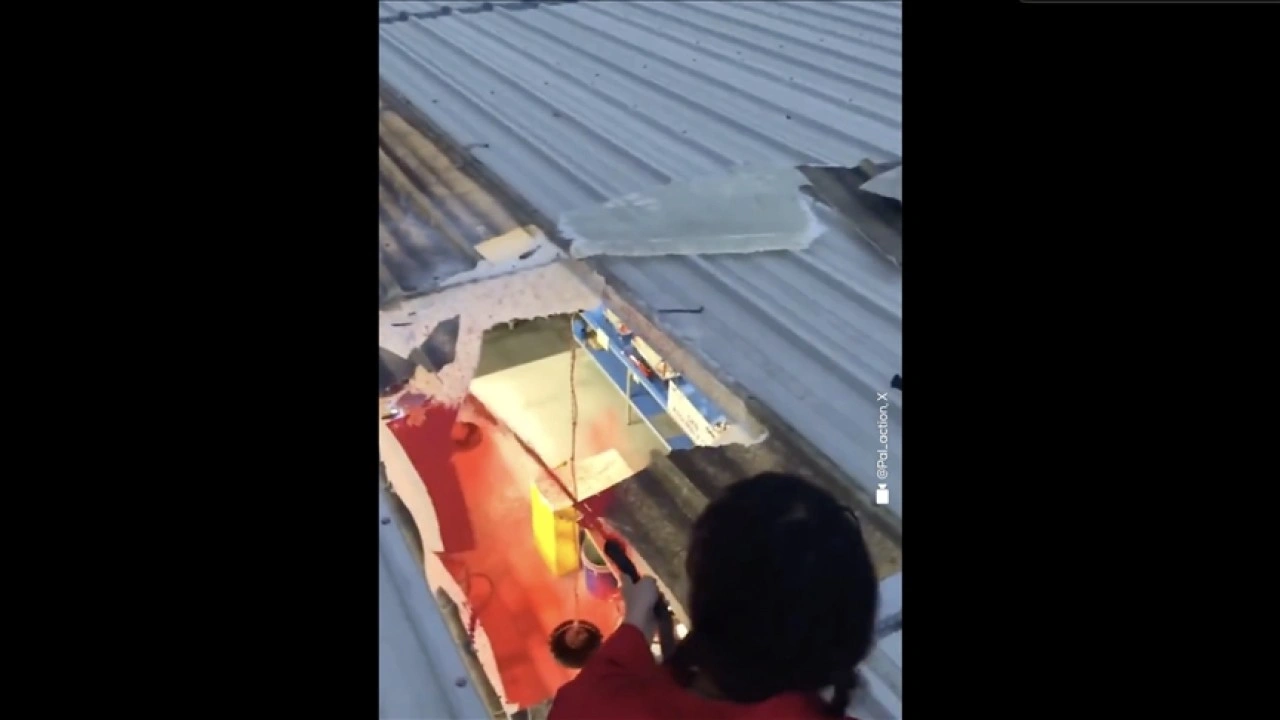 Grubun, X hesabından paylaştığı görüntüde, Filistin destekçisi aktivistin çatının bir kısmını açarak elindeki kırmızı boyayı, tesisin içine döktüğü görüldü.
