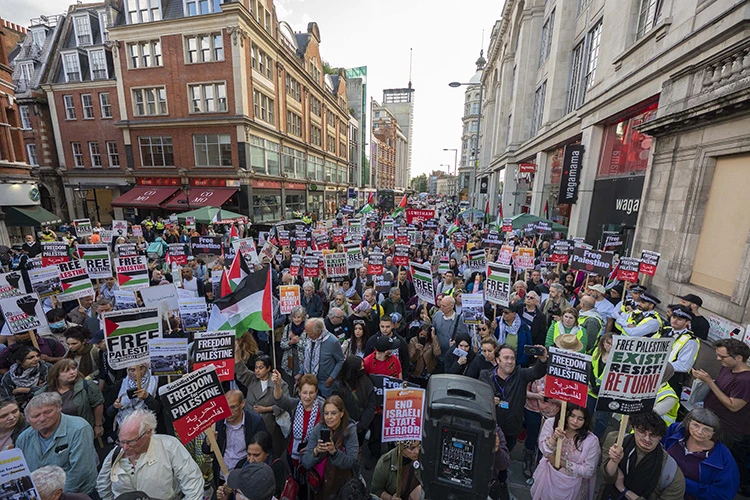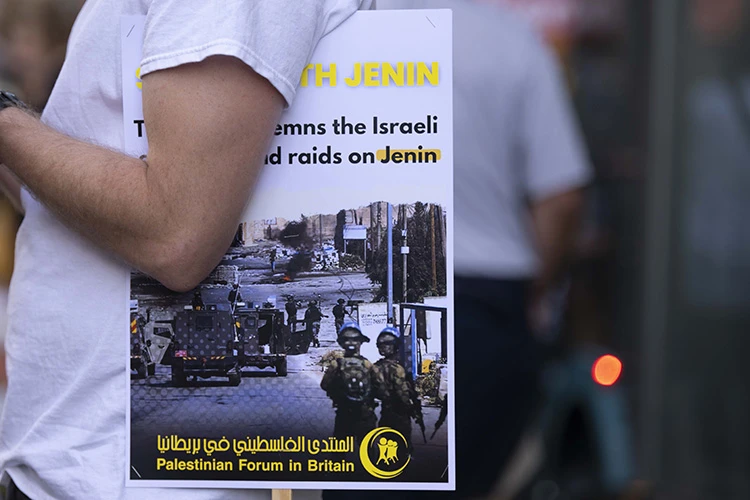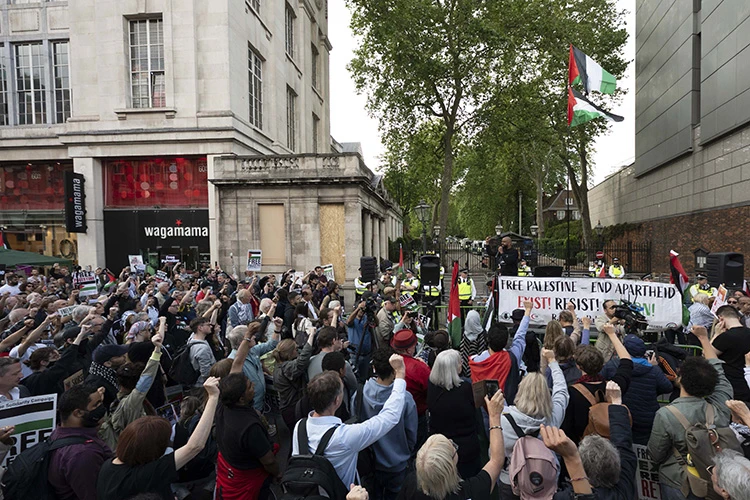 İsrail'in Cenin'e yönelik saldırılarını protesto etmek için İsrail'in Londra Büyükelçiliği önünde düzenlenen gösteriye çok sayıda vatandaş katıldı.