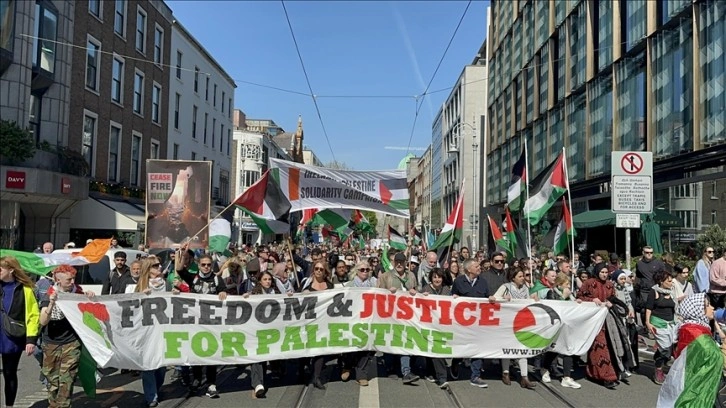 Filistin ve İrlanda bayrakları taşıyan göstericiler, buradan "Kildare Street"e yürüdü.
