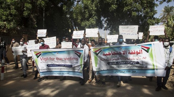 Başkent Hartum'daki Abu Dabi Büyükelçiliği önünde toplanan yüzlerce genç, "Sudan aşağılanamaz, parayla satılamaz.
