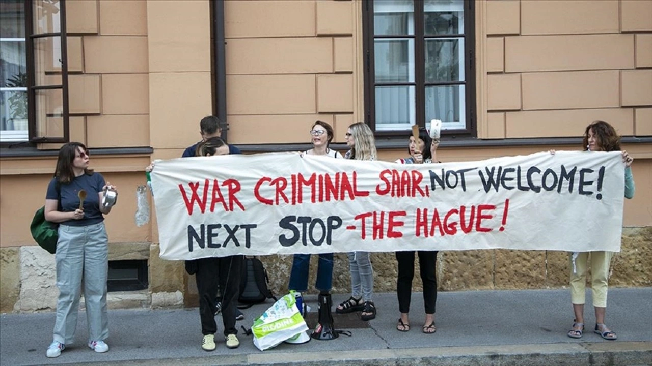 Hükümet binasın önünde bir araya gelen bir grup, İsrail'in Gazze'de işlediği soykırım suçunu protesto ederek, Saar'a yönelik "savaş suçlusu Saar, hoş gelmedin, bir sonraki durak Lahey" yazılı pankart açtı.