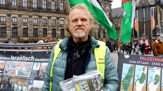 Hollandalı aktivist Simon Vrouwe, İsrail'in Filistin'deki zulmüne dikkati çekmek amacıyla yaklaşık 4,5 yıldır başkent Amsterdam'da tek başına gösteri yapıyor.