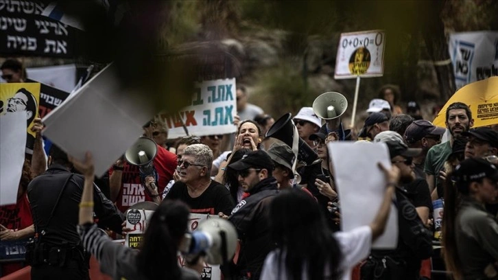 İsrail'de Savaş Kabinesi Üyesi Benny Gantz'ın evinin önünde Gazze'deki savaşın bitmesi, esirlerin geri getirilmesi, hükümetin istifası ve erken seçim çağrısıyla gösteri düzenlendi.