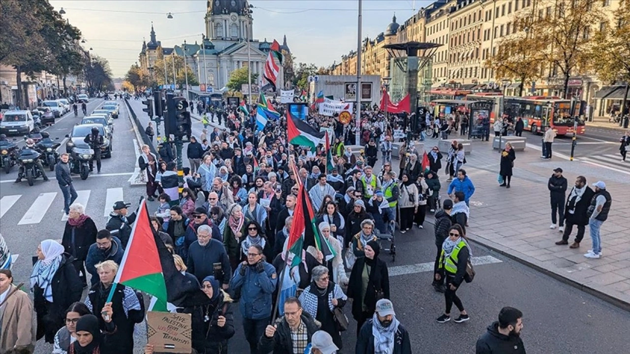 Odenplan bölgesinde toplanan göstericiler, İsveç Parlamentosuna doğru yürüyerek, İsrail'in saldırılarını kınadı.