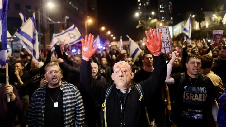 Batı Kudüs'te Cumhurbaşkanı Isaac Herzog'un konutunun önünde toplanan yaklaşık bin kişilik grup, yakınlardaki meydana yürüyerek hükümetin istifası talebiyle gösteri gerçekleştirdi.